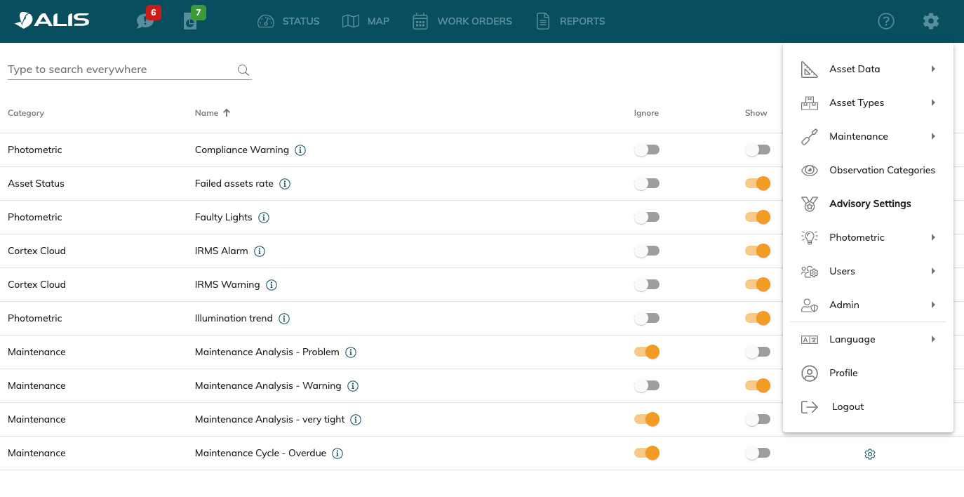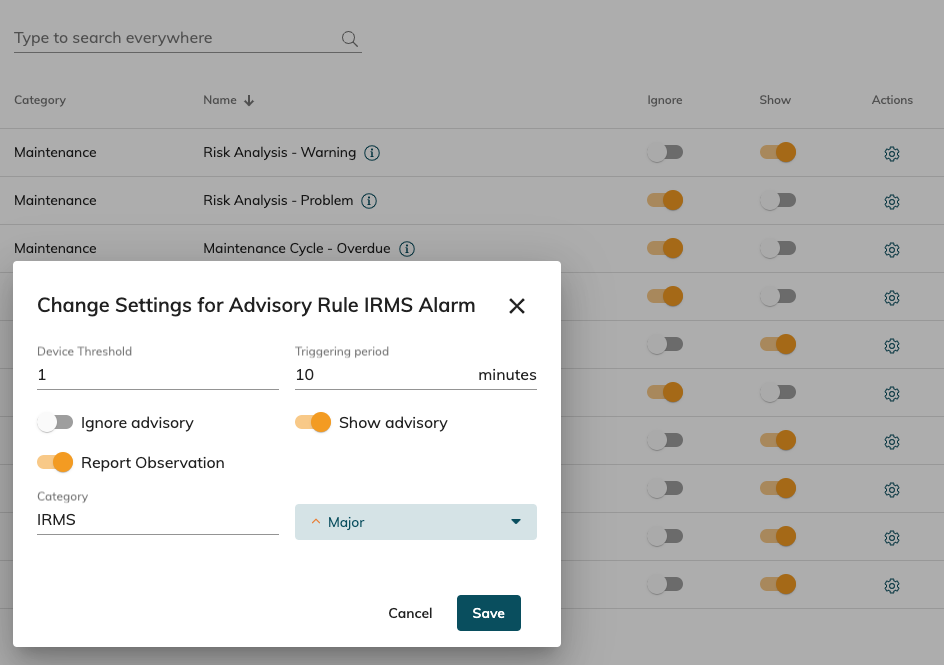 We have foreseen different categories such as maintenance or asset status related rules. An advisory-rule has a certain set of parameters to adjust it's behaviour (e.g. the threshold to raise).