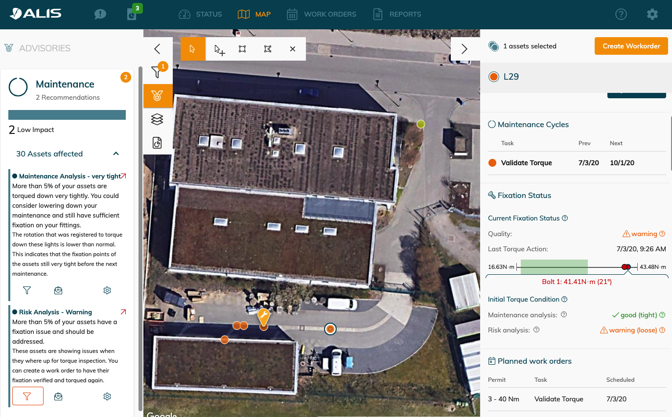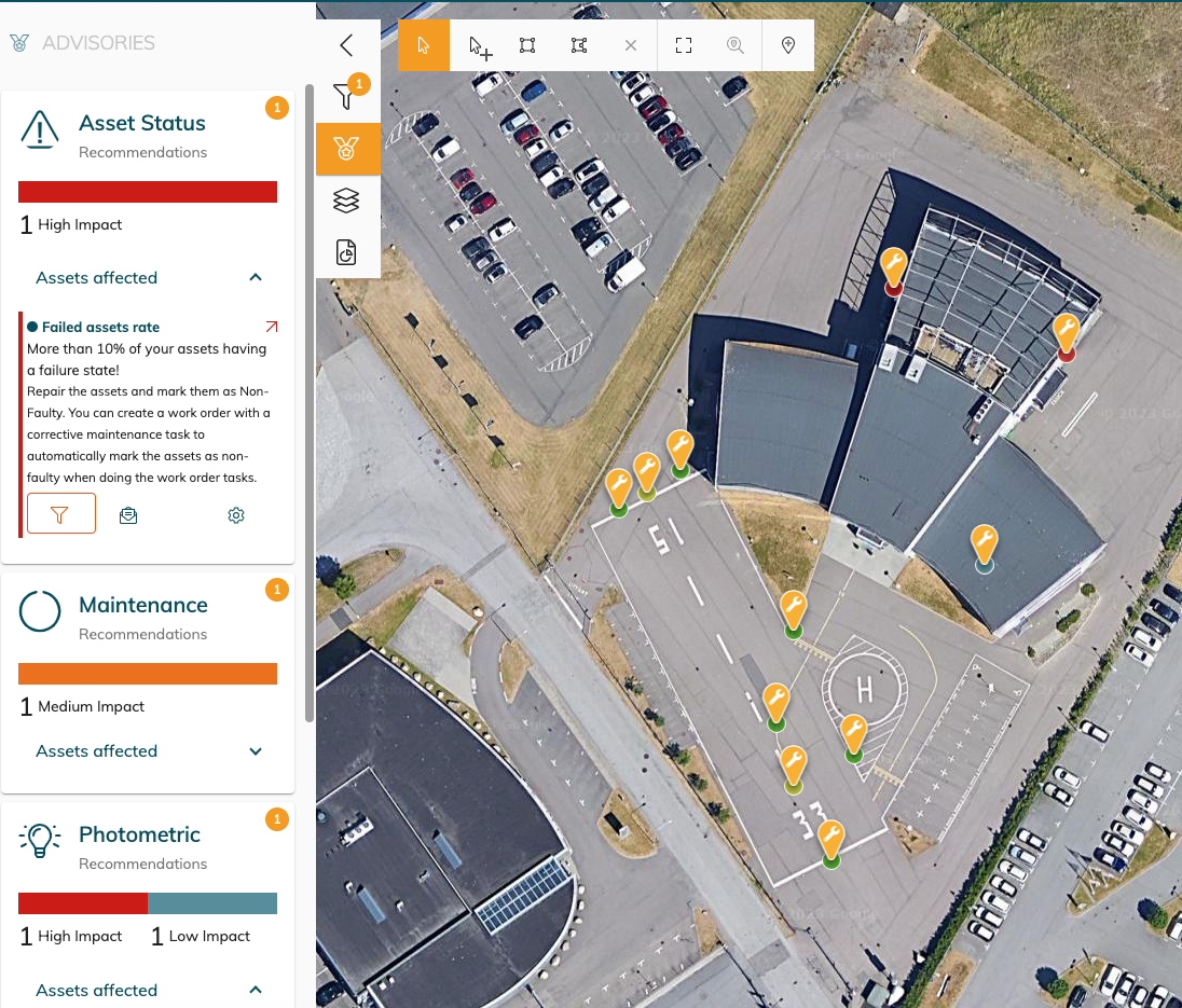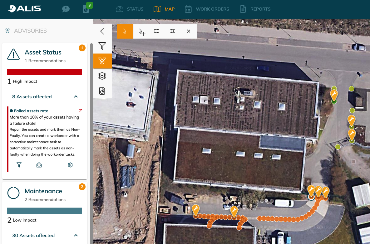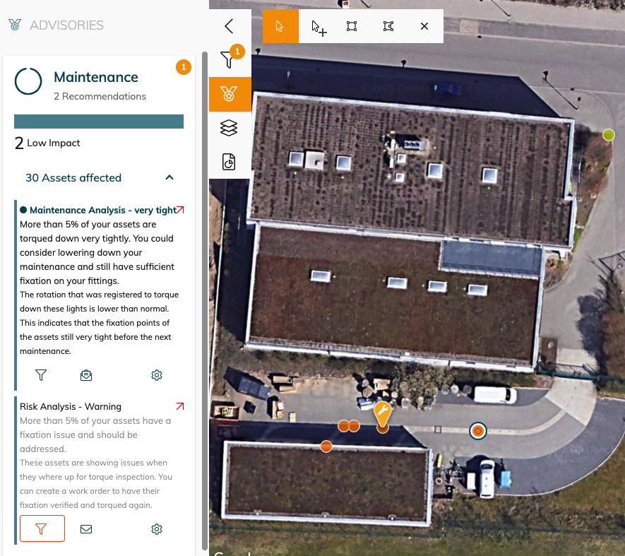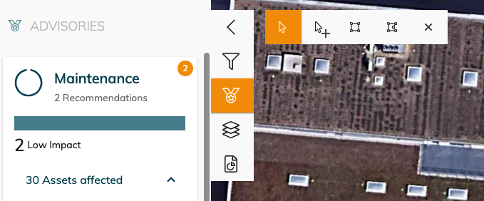 When an advisory is triggered , it is shown in the map and we will mention the amount of assets which it applies too. You can click on the filter button to view on the map the asset which are affected.