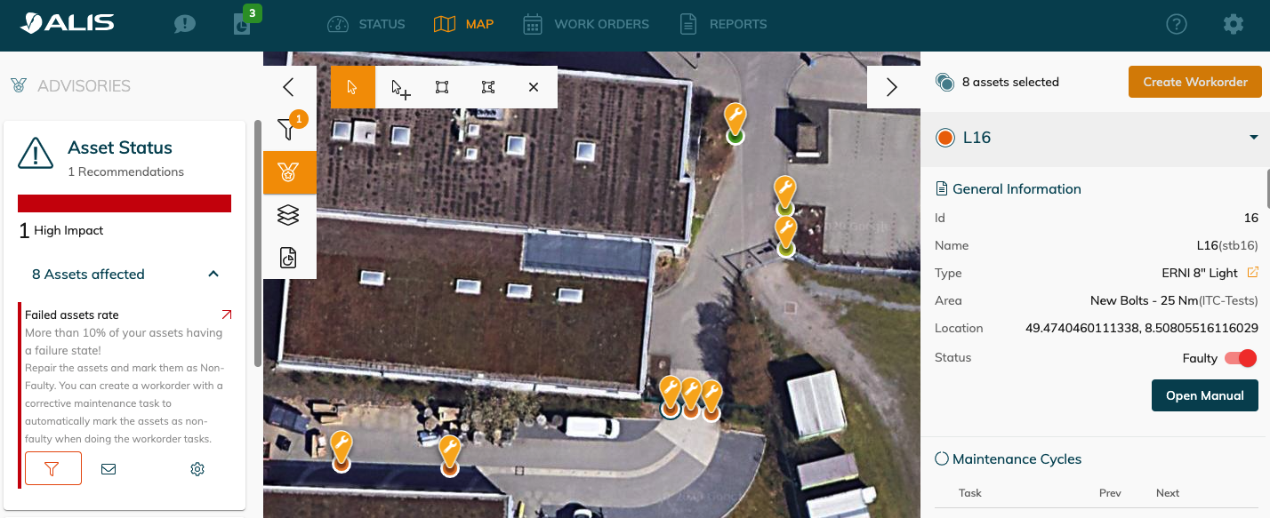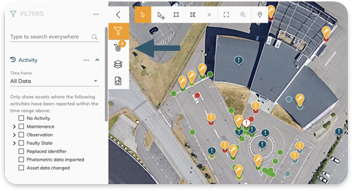 We can now simply filter out these 8 assets, by use of the filter icon to then select these assets with the selection tool to create a work order to fix the faulty assets.