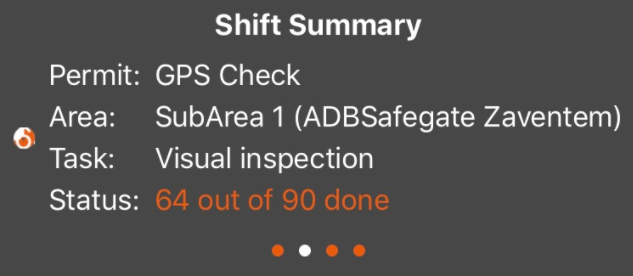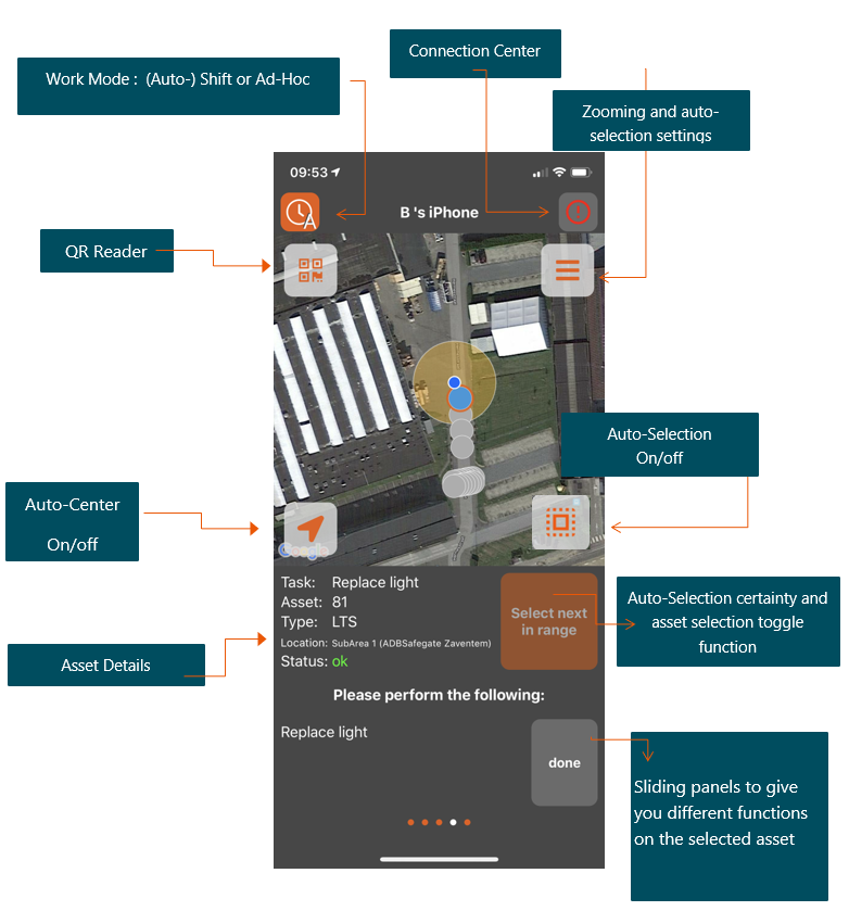 The bottom part of the app is build up out of different Panels that can slide to left or right which brings you more information concerning the Workorder /task or asset . The panels shown depends on the Mode you are in.
