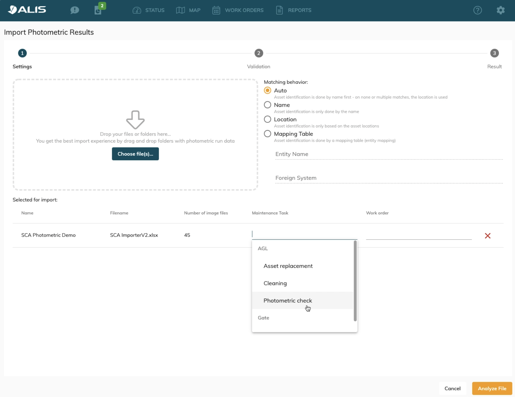 Location: Asset identification is only based on the asset locations. This option can be used of the measurements include the location of the measurement (Requires GPS module in your in-field Photometric measurement equipment). CORTEX Service will look at which asset is in the proximity of your measurement location and match the two together.