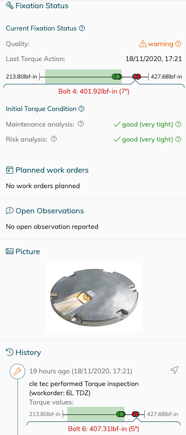 When we show the torque values that where applied on assets in the ALIS Webapplication - there is a green corridor that gives you an indication on where the torque values should be at. If the values are outside of this green corridor the asset will show up as a "Warning " for the Fixation quality in the fixation status filter because the asset was not torqued under the correct conditions.