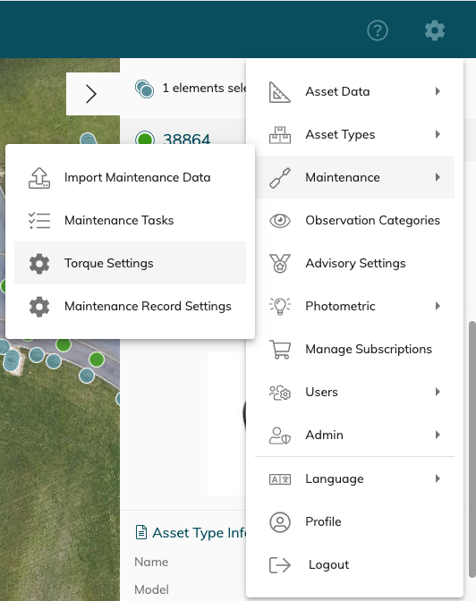 To change the torque limits select the Settings Icon on the top Right > Maintenance > Torque Settings.
