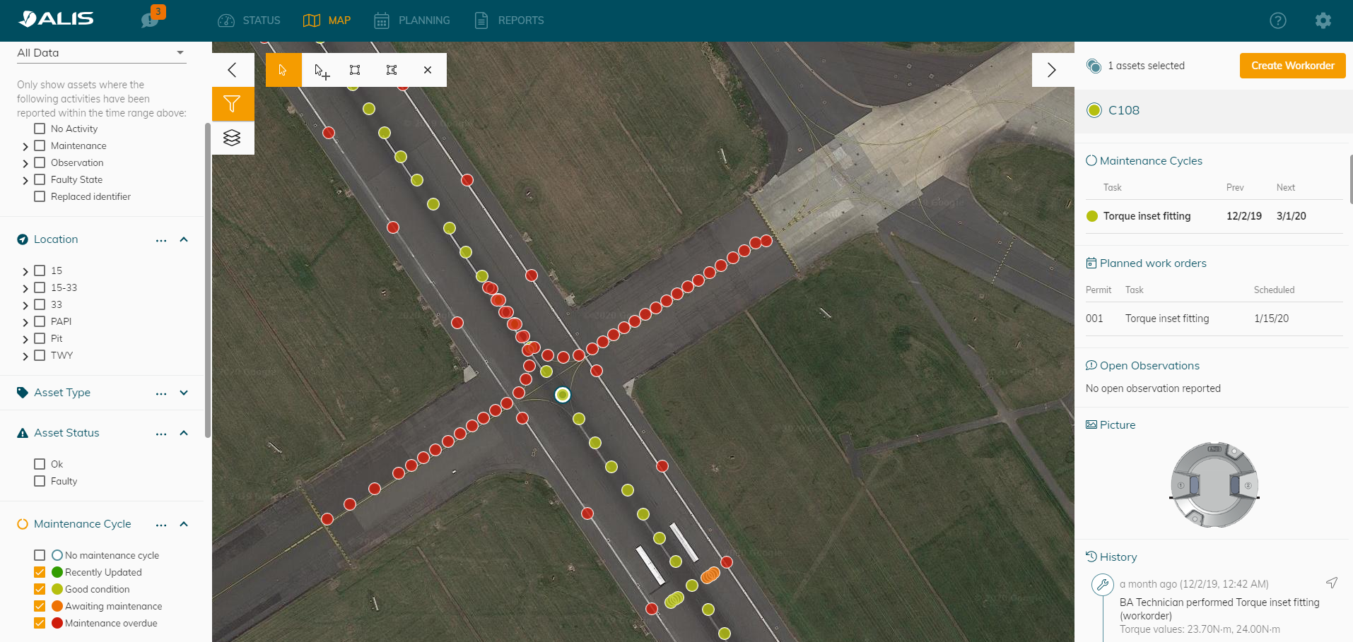 When the preventive maintenance was performed in the defined period it will start by showing dark green and gradually move to orange color ( in gradations of 0% - 33 % - 66 % - 100% % of the total preventive cycle time ). When the time of maintenance is overdue ( >100 % of the cycle time ) it will show red.